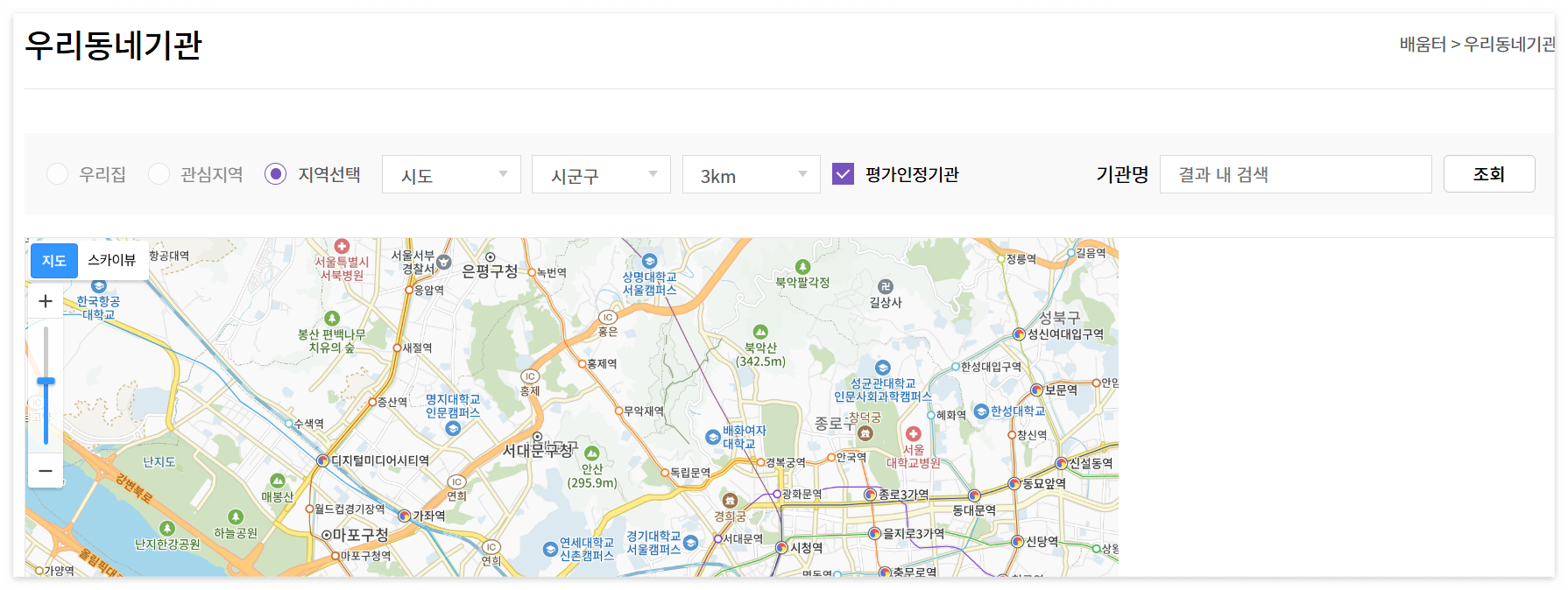 학력 인정 시설, 자격증 교육 시설, 문화·예술 프로그램 시설 등 시설 유형별로 검색할 수 있습니다.