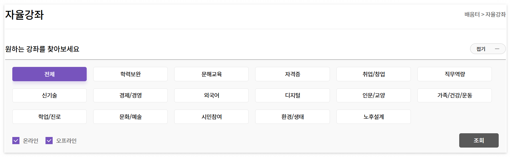 각 카테고리 내에서 제공되는 세부 필터를 통해 지역, 학습 유형, 학습 시간, 비용 등을 세부적으로 설정할 수 있습니다.